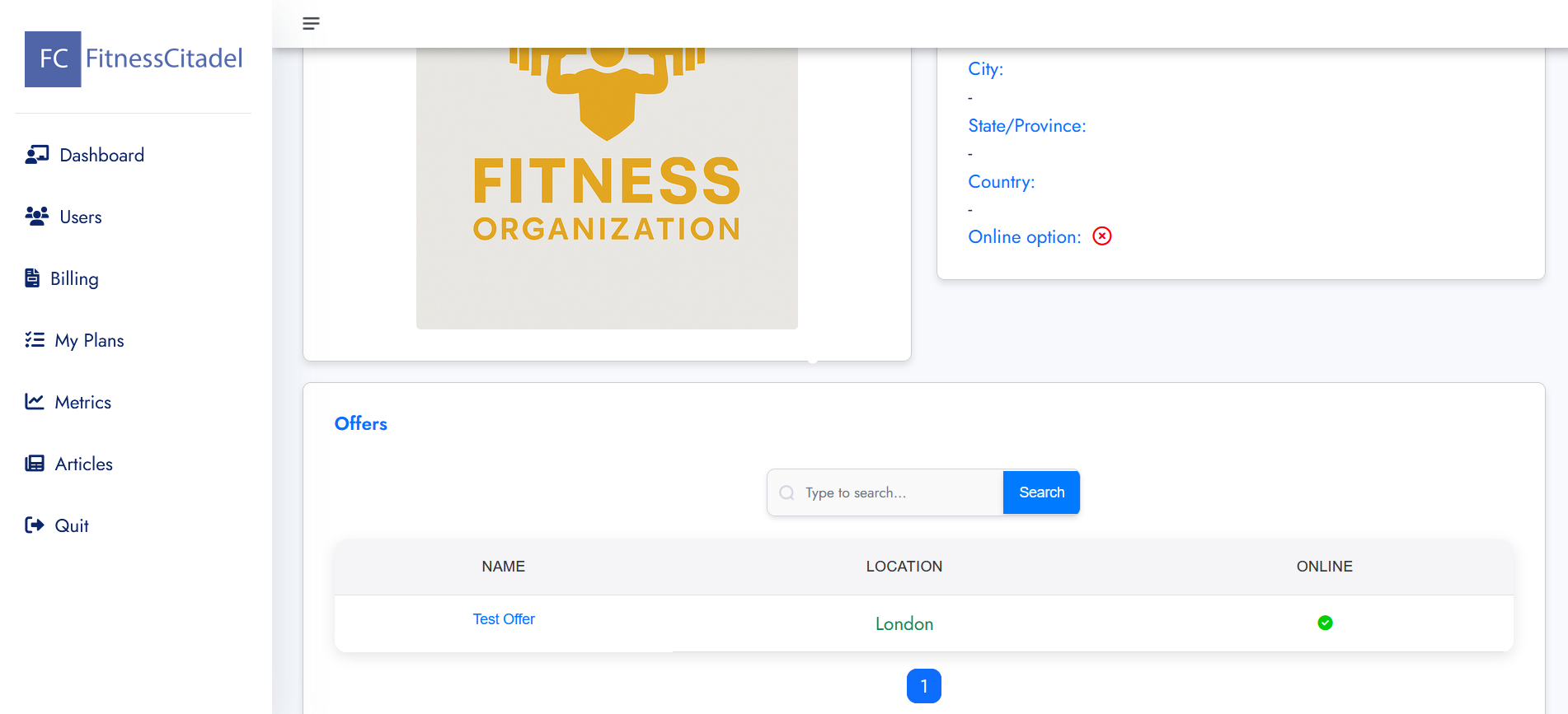 – From the dashboard you can navigate to available apps like Users, Billing, Plans, Metrics and Articles.