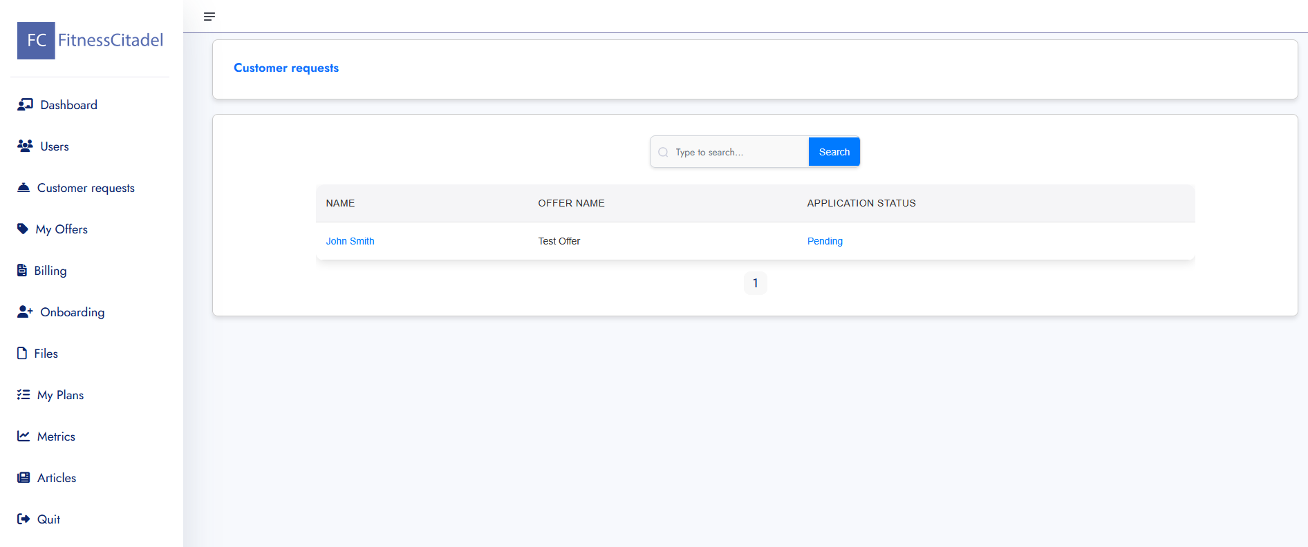 – Each request contains key information such as the customer’s name, email, selected offer, submission date, and current status (e.g. Pending, Approved, Rejected).