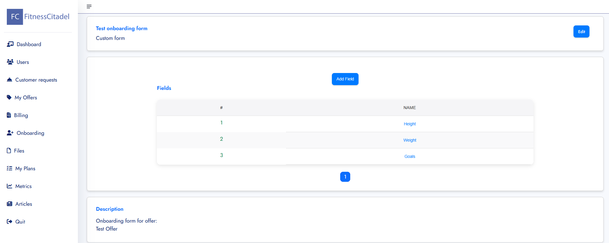 – Each form is linked to a specific offer and can include multiple fields (e.g. Weight, Height, Fitness Goal), which can be added, edited, or removed at any time.