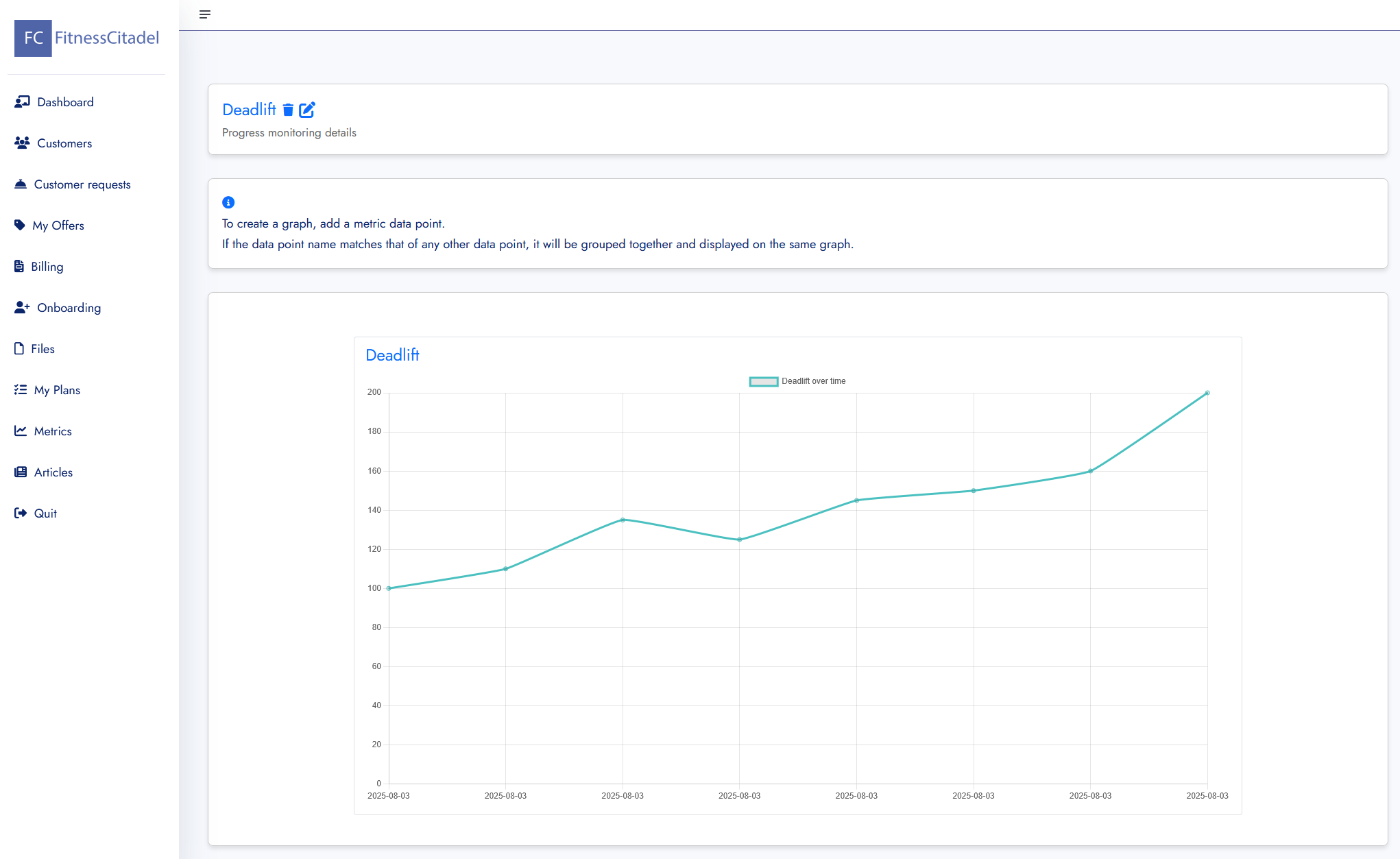 – The Metrics app allows you to track and visualize your customers’ progress over time using custom performance data points (e.g. strength PRs, bodyweight, measurements).